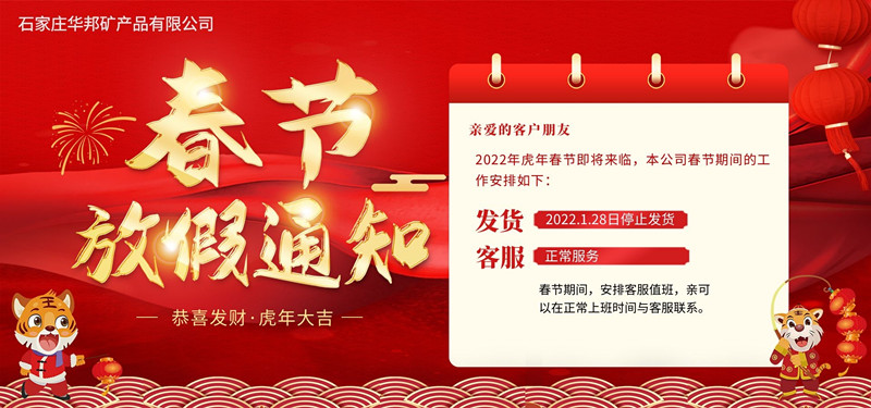 虎節(jié)春節(jié)將至,石家莊華邦礦產(chǎn)品有限公司祝您在新的一年里身體健康,生意興隆,并感謝您在過(guò)去的一年中對(duì)我們的支持!